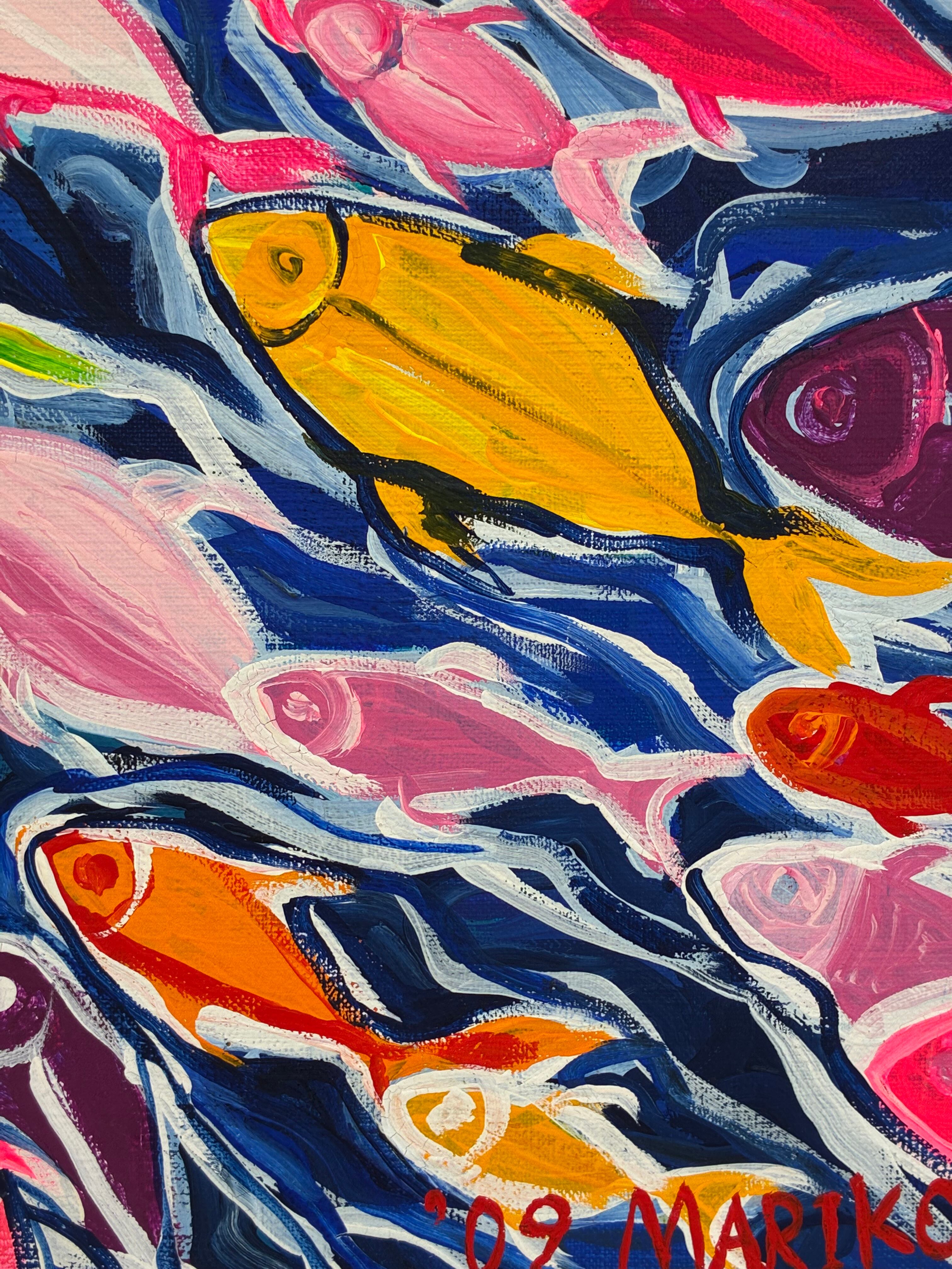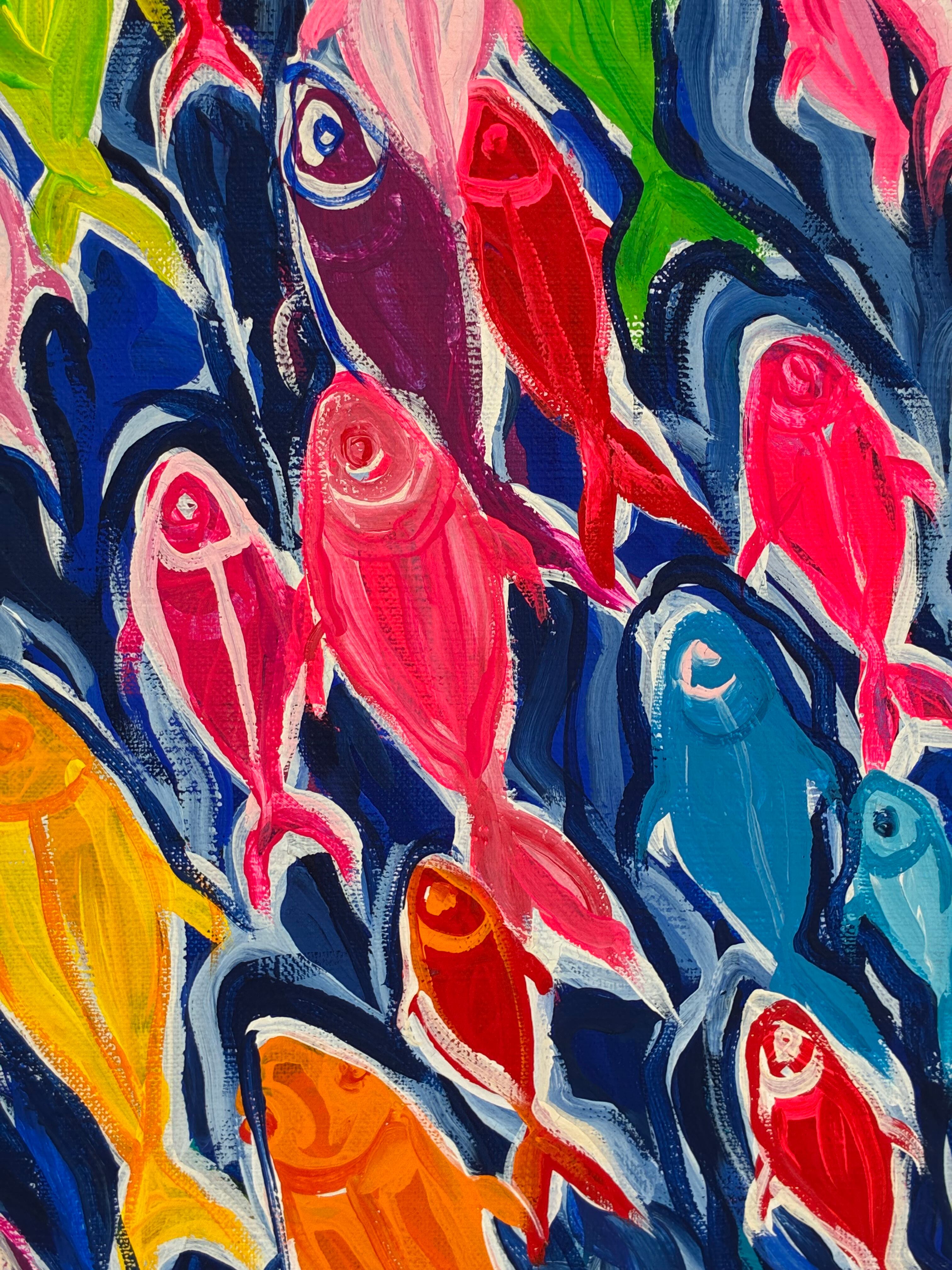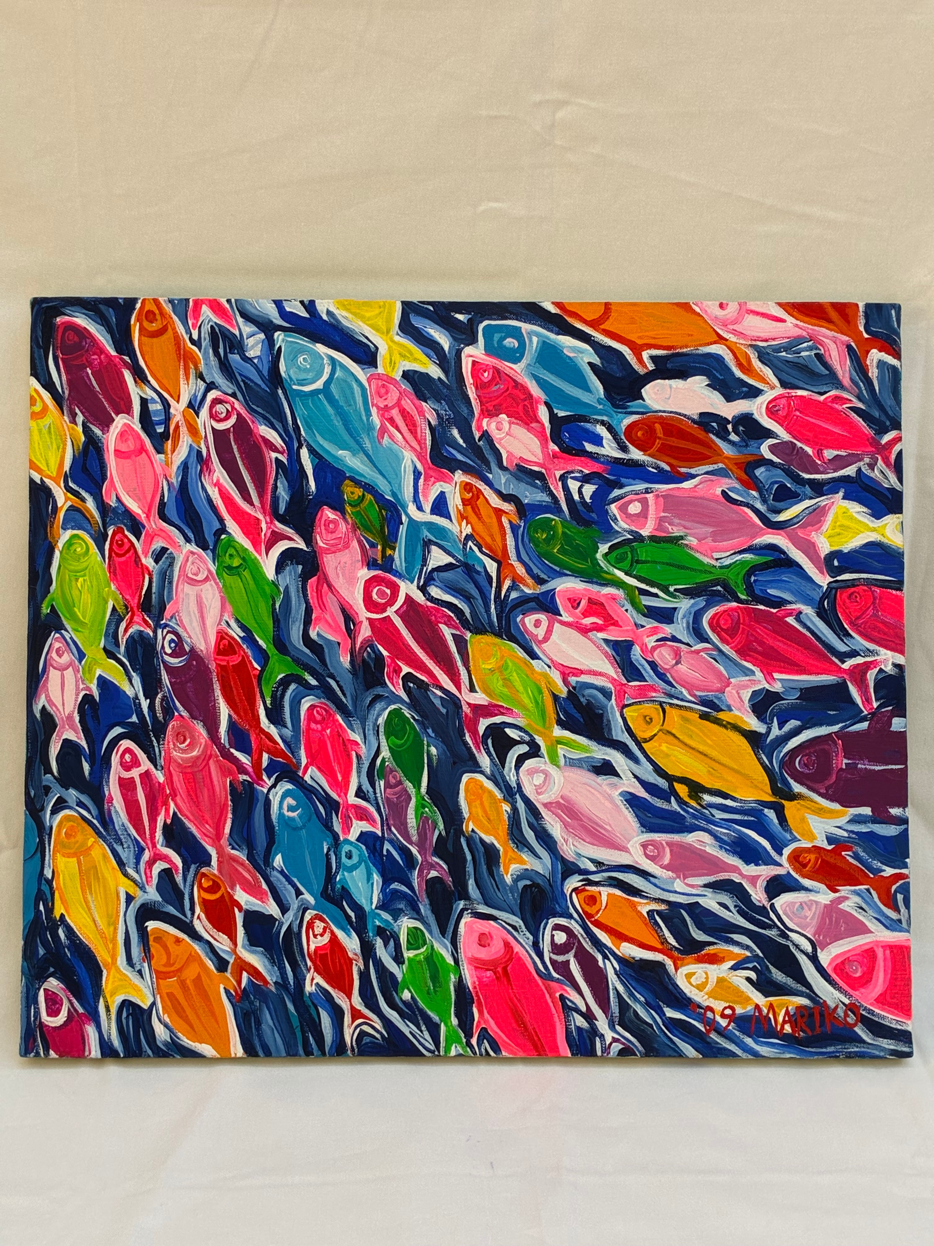 魚の群れをカラフルな色彩で描きました。